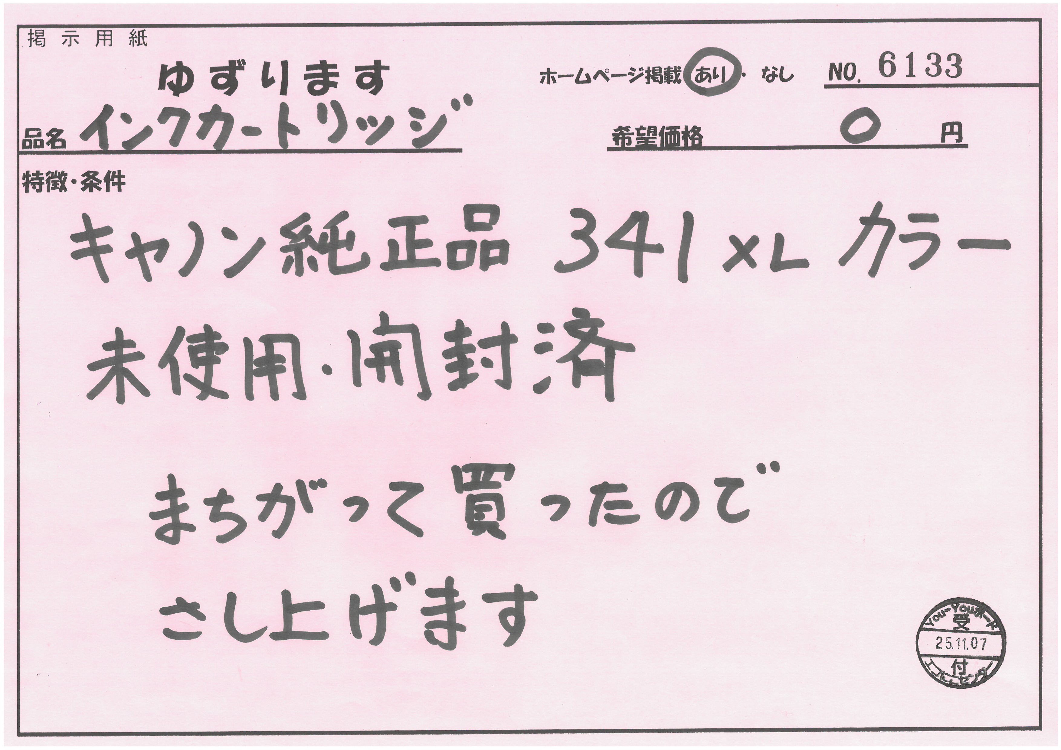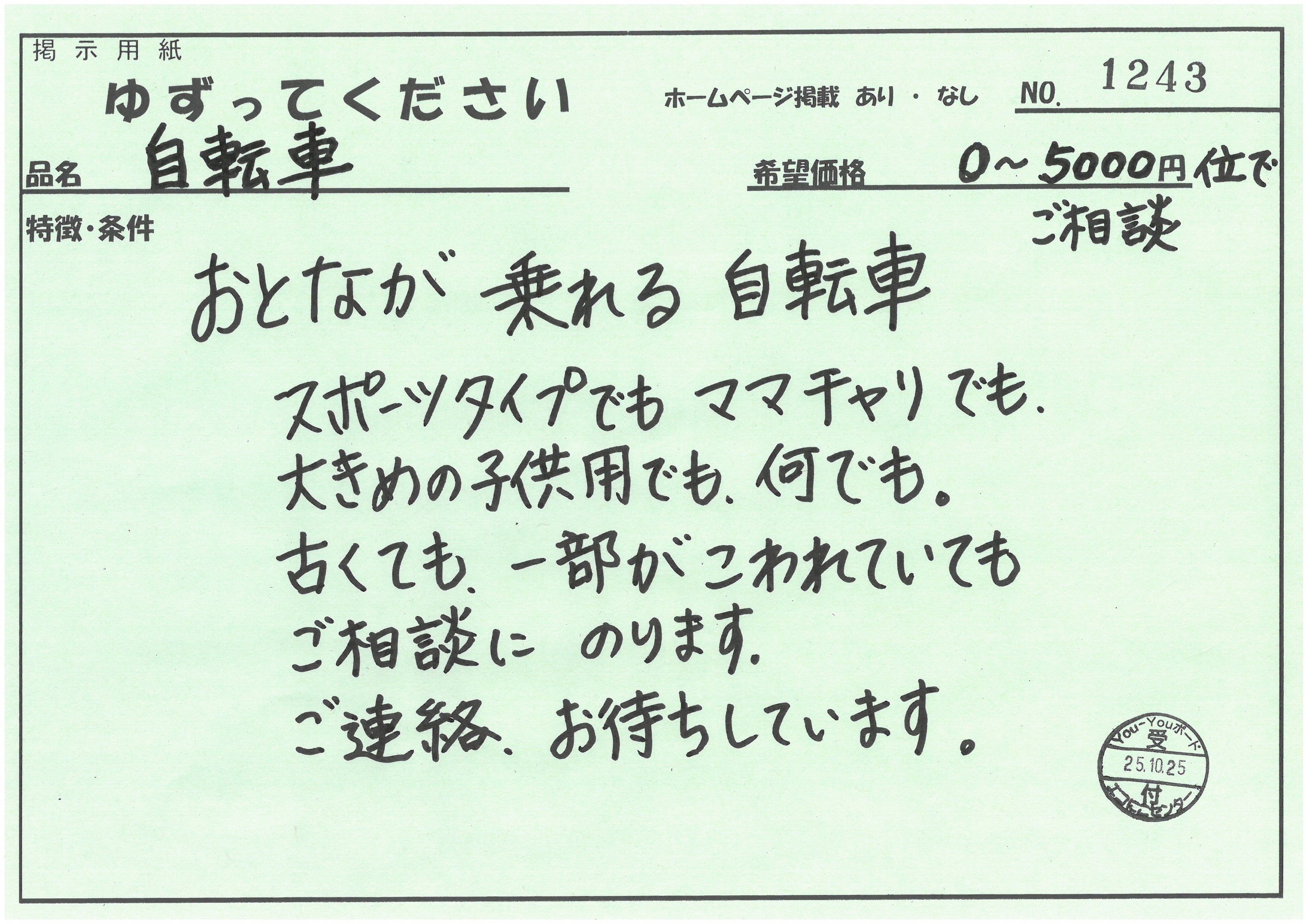 • 譲りたいものや譲ってほしいものが見つかった方は「掲示用紙」の番号を事務室窓口に伝え、「希望カード」に必要事項を記入してください。その際には身分証明書の提示をお願いします。