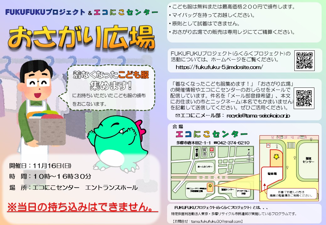 掲載日 11月1日(土) 11月16日(日)は「おさがり広場」開催! 「着なくなったこども服集めます!」にて集まったこども服の頒布をする「おさがり広場」を11月16日(日)に開催します。 エントランスホールを使ってこども服を安価で販売(一部無料)するイベントです。 なお、2階の常設展示のフロアは立入禁止になりますのでご協力をお願いいたします。 10時~16時30分までの開催です。お間違えのないようお越しください。