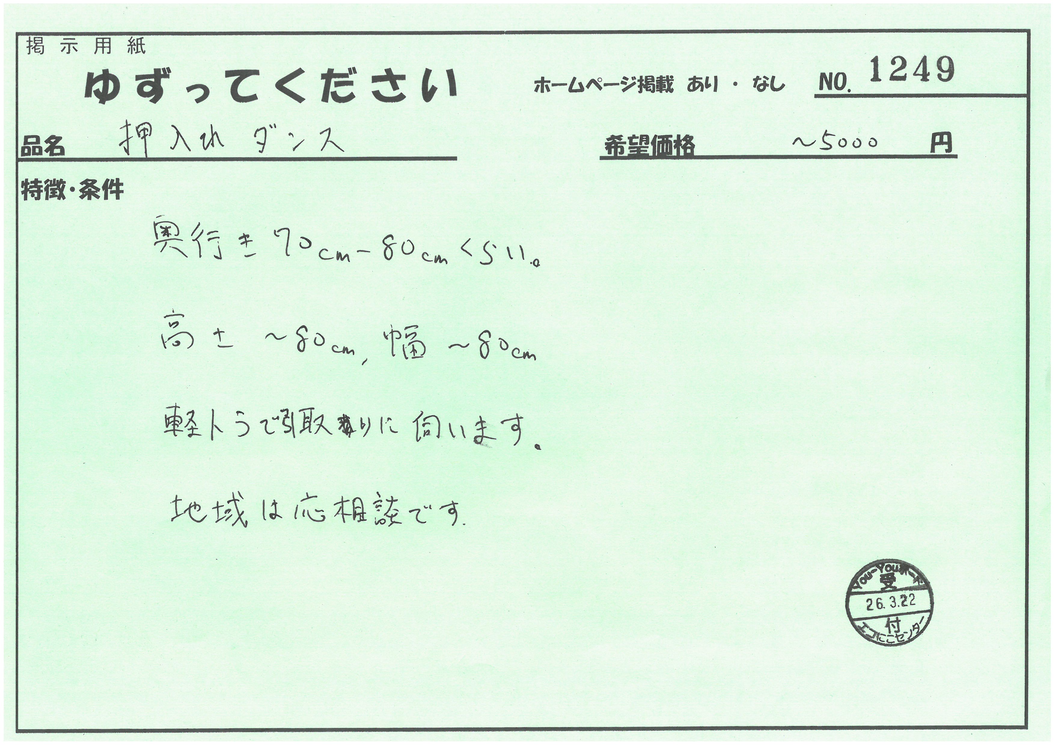 - 譲りたいものや譲ってほしいものが見つかった方は「掲示用紙」の番号を事務室窓口に伝え、「希望カード」に必要事項を記入してください。その際には身分証明書の提示をお願いします。