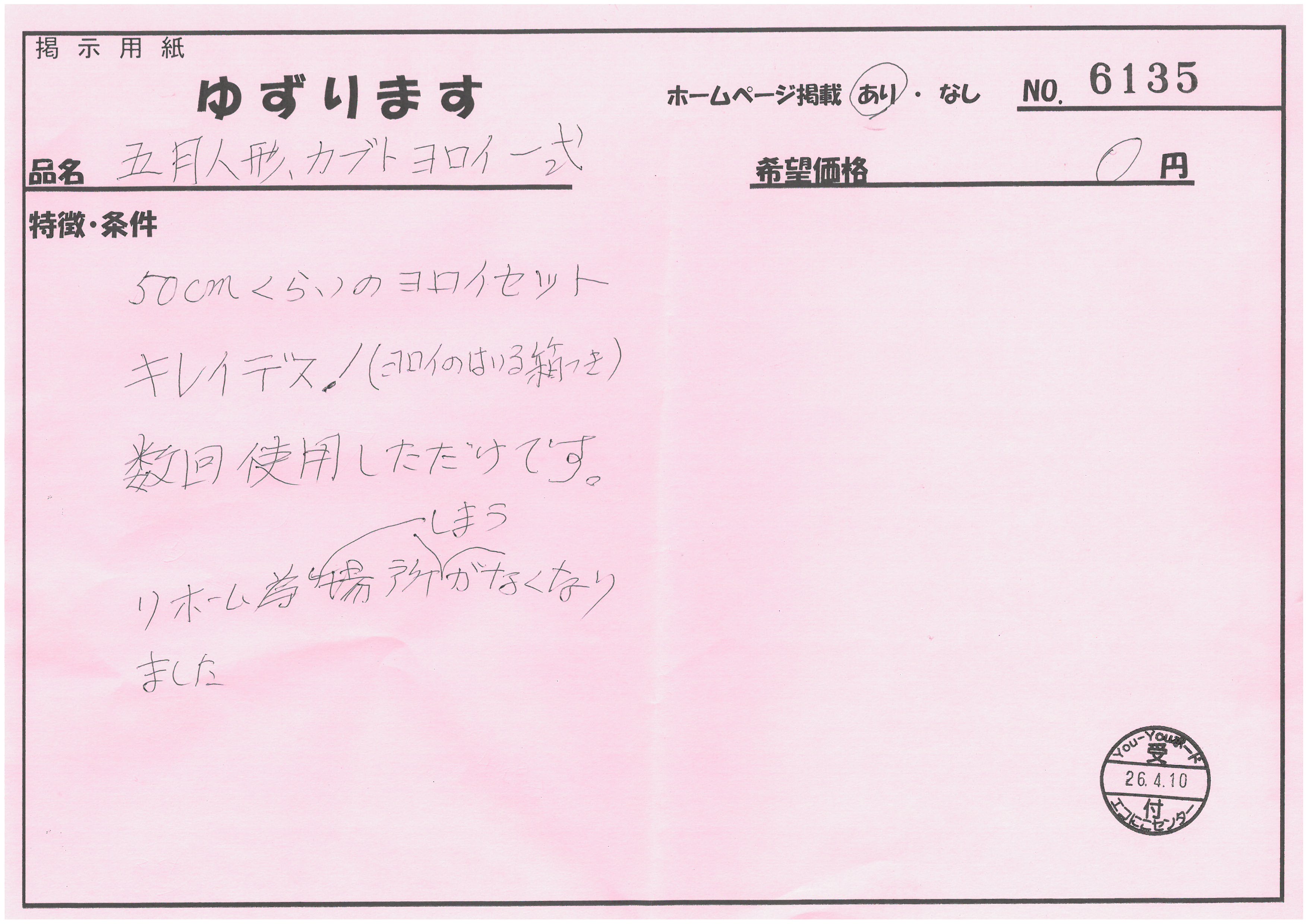 - 譲りたいものや譲ってほしいものが見つかった方は「掲示用紙」の番号を事務室窓口に伝え、「希望カード」に必要事項を記入してください。その際には身分証明書の提示をお願いします。