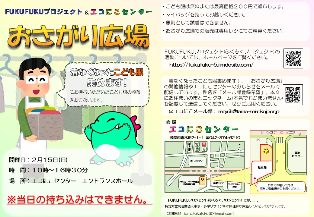 掲載日 1月31日(土) 2月15日(日)は「おさがり広場」開催! 「着なくなったこども服集めます!」にて集まったこども服の頒布をする「おさがり広場」を2月15日(日)に開催します。 エントランスホールを使ってこども服を安価で販売(一部無料)するイベントです。 なお、2階の常設展示のフロアは立入禁止になりますのでご協力をお願いいたします。 10時~16時30分までの開催です。お間違えのないようお越しください。
